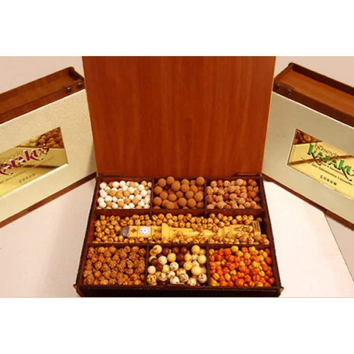 7 bölmeli özel kutuda çikolatalı sade ve diğer özel çeşit leblebilerimizden özel çantası ile birlikte gönderilir