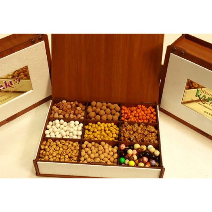 9 bölmeli özel kutuda Acılı, çikolatalı, sade, ballı, meyveli, gevrek v.b. özelçeşit leblebilerden oluşur. Özel çantası ile birlikte gönderilir.