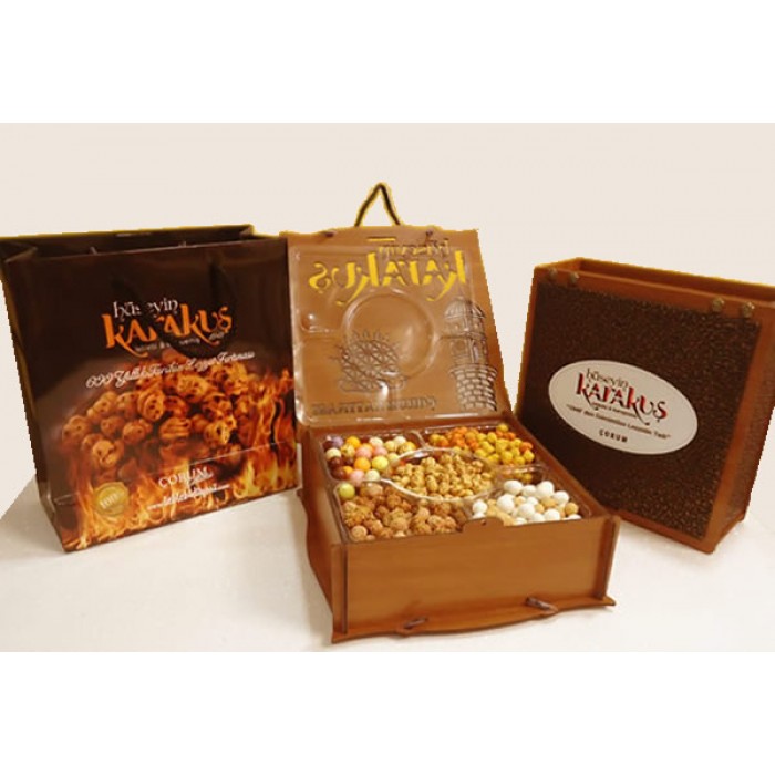 Beş bölmeli özel kutuda Acılı, çikolatalı, sade, ballı, gevrek leblebilerden oluşur. Özel metal kutusu özel kulplu çantası ile birlikte gönderilir.